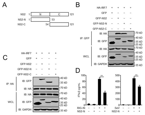 To explore which domain of NS2 was involved in the interaction with IRF7, we constructed two vectors expressing the two domains of NS2 (Figure 5A), the N-terminal domain (NS2-N, amino acids (aa) 1 to 53) and the C-terminal domain (NS2-C, aa 54 to 121) []. HEK293 cells were transfected with GFP-NS2, GFP-NS2-N, or GFP-NS2-C along with HA-IRF7, and Co-IP assays were performed with anti-HA and anti-GFP antibodies. We found that the N-terminal domain of NS2 was immunoprecipitated by IRF7, and reciprocally, IRF7 could be immunoprecipitated by the N-terminal domain of NS2, whereas the C-terminal domain of NS2 did not interact with IRF7 (Figure 5B,C). As shown in Figure 5D, the N-terminal domain of NS2 inhibited the production of IFN-Ξ² triggered by RIG-IN and SeV. Therefore, the N-terminal domain of NS2 was the critical domain for the interaction with IRF7 and inhibition of IFN-Ξ² production.