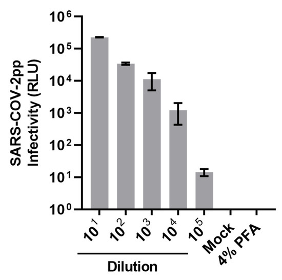 Titration of SARS-CoV-2 pseudoparticles (SARS-CoV-2pp). The serial dilution of SARS-CoV-2pp stock was used to infect Huh-7 cells for 2 h. Viral infectivity was measured by luciferase reporter activity (relative light units; RLU) after 72 h incubation. Data shown are collected in triplicate and expressed as mean ± standard deviation (SD). Paraformaldehyde (PFA; 4%) fixed cells infected with 10× diluted SARS-CoV-2pp stock was included as a negative control.