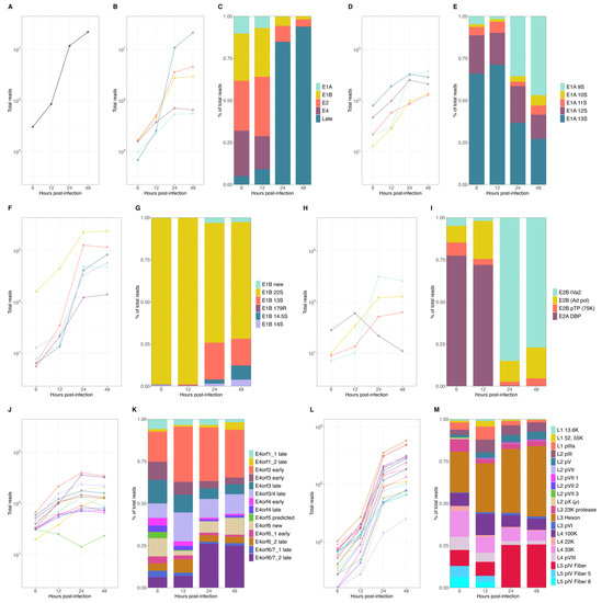 Expression levels of HAdV-C5 mRNAs at early and late time points p.i. Different time points p.i. of (A) total viral mRNA expression values, (B) changes in abundance of the different viral mRNA species produced from each TU, and (C) corresponding proportions of all viral reads. Analyses of changes in abundance of mRNAs and the corresponding relative proportions were performed for individual transcripts of each viral transcription unit: E1A (D,E), E1B (F,G), E2 (H,I), E4 (J,K), and ML (L,M).