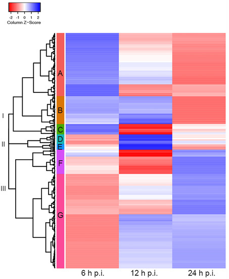To study the effects of HAdV-C5 infection on cytoplasmic accumulations of cellular mRNAs, we performed a global examination of the cytoplasmic to nucleoplasmic cellular mRNA ratios (cyto/nuc) focusing on the transition from the early to late phase of infection (see Section 2), considering that our earlier analyses indicated that this transition period appears to be at 12–24 h post-infection. The data were selected by filtering with a false discovery rate (FDR)-corrected p-value of ≤0.05, obtaining a total of 737 cellular transcripts. To focus the analysis on cyto/nuc ratios with significant changes during infection, ratios with greater than 2-fold changes between at least two sampling time points p.i. were selected. This adjusted dataset included 339 cellular mRNAs for which the nucleocytoplasmic partitioning was significantly altered during infection. The cellular mRNAs with similar changes in cyto/nuc ratios were clustered, and we generated a heat map to visualize changes at different time points p.i. (Figure 3). The clustering analysis revealed three main branches (I–III) depicting the main cyto/nuc variation patterns at different time points p.i. From these main branches, we identified seven distinct clusters (A–G) (Table S2). Overall, the data showed considerable changes in the cyto/nuc ratios of cellular mRNAs during infection. First, most mRNA cyto/nuc ratios were inverted when comparing 6 to 24 h p.i., with the 12 h p.i. time point appearing to be a transition phase. Second, cyto/nuc ratios of mRNAs nicely clustered together, suggesting that the mRNAs of certain clusters accumulate more efficiently in the cytoplasm during the early phase of infection (Figure 3, clusters A, B, and C), while a large set of cellular mRNAs had higher cyto/nuc ratios at 24 h p.i. (Figure 3, clusters F and G), indicating that the latter mRNAs accumulate in the cytoplasm more efficiently during the late phase of infection. Hence, cellular mRNA export is not blocked during the late phase of viral replication. The data rather show that the transition from the early to the late phase results in extensive variations in the cellular mRNA species that are exported to the cytoplasm.