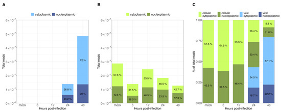 Intracellular distribution of viral and cellular mRNAs at different time points post-infection. All RNAseq reads were assigned to (A) viral and (B) cellular transcripts. Total reads at each time point p.i. are represented as bar graphs. (C) Proportions of cytoplasmic or nucleoplasmic reads are shown for each time point p.i.
