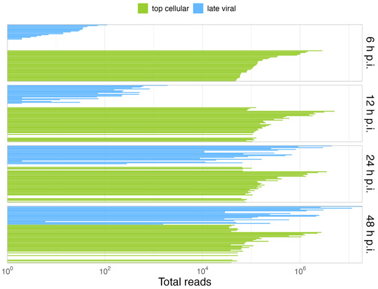 Viral late mRNAs are comparable in abundance to the most abundant cellular mRNAs in the late phase. Shown is the comparison of the relative abundances of the 35 most abundant cellular mRNAs (green) vs. the viral late mRNAs (blue), at each time point p.i. A detailed list of the cellular top transcripts and their rank in terms of abundance can be found in Table S3.