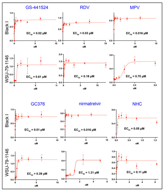 The half-maximal effective concentration (EC50) for each antiviral compound was determined through a colorimetric bioassay to determine the concentration of drug required to obtain 50% of its maximal effect (EC50), as a modification of a previously described method [16]. Select FIPV-infected feline cells demonstrate cytopathic effect (CPE), which results in cell injury and loss (or attenuation) of the cell monolayer. Virus-associated CPE can therefore be quantified colorimetrically (loss of absorbance) using a plate reader and can be utilized as a surrogate metric for viral infection. For each assay, a progressive two-fold compound dilution series ranging from 50 to 0.05 μM (10 dilution step series) was performed in tissue culture media [either Minimal Essential Media (MEM)/FBS (FCWF-4 CU cells with Black I) or Dulbecco’s MEM/FBS (CRFK cells with WSU-79-1146)]. FCWF-4 CU (Black I) or CRFK cells (WSU-79-1146) were plated in 96-well tissue culture plates at approximately 25,000 cells per well in their respective media (MEM/FBS or DMEM/FBS, respectively), incubated for 24 h, and then infected with either Black I or WSU-79-1146 virus at a multiplicity of infection (MOI) of 0.1 (one infectious virion for every 10 cells). The virus-infected tissue culture plates were incubated for 1 h and then treated with serially diluted antiviral compounds. Control wells included cells only, and cells with virus but no antiviral agents. All experimental treatments were performed in six well replicates. Culture plates were incubated for 72 additional hours at 37 °C in CO2 incubator, fixed with methanol, stained with crystal violet, and scanned for absorbance at 620 nm using an ELISA plate reader (Softmax Pro, Molecular Devices, Silicon Valley, CA, USA). The absorbance data were graphed and the EC50 calculated by plotting a non-linear regression equation (inflection point of the dose-response curve) using Prism 9 software (GraphPad, San Diego, CA, USA).