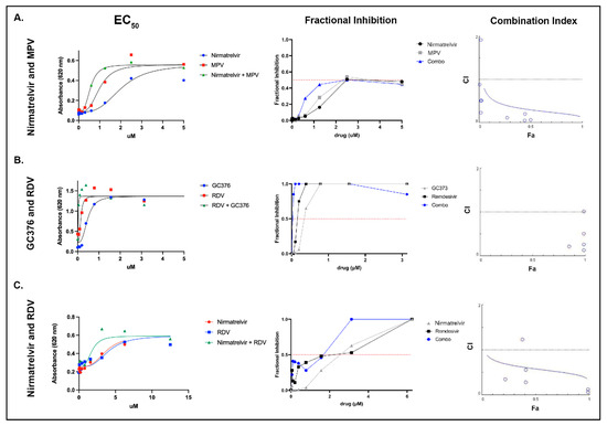 Similarly, fractional inhibition curves are shifted left for every drug combination evaluated except for nirmatrelvir combined with RDV between 1 and 2 μM (Figure 2, middle column). Further, these curves show that the combination of GC376 and remdesivir reached almost complete fractional inhibition at the lower range of compound concentration, nirmatrelvir combined with MPV only reached approximately 50% fractional inhibition, and nirmatrelvir combined with RDV approached 100% fractional inhibition at approximately 2.5 μM.