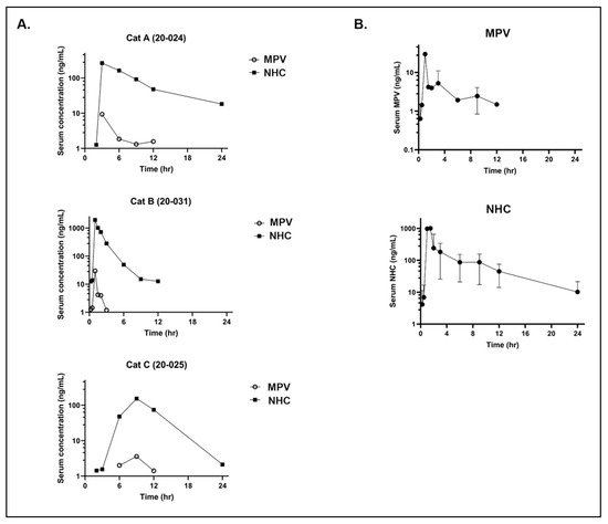 Serum detection of prodrug MPV and the metabolite NHC over a 24-h time period in cats. (A) Detection of MPV and NHC in the serum (ng/mL) of each individual cat over 24 h. (B) Combined detection of MPV and NHC in three cats over 24 h.