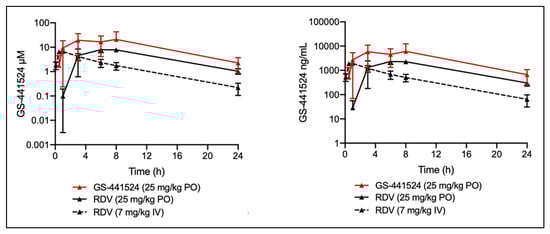 In the oral RDV cohort, GS-441524 exhibited an average plasma Cmax of 2480 ng/mL (7.9 µM) at a corresponding Tmax of 6 h. The average AUC0-24 value was found to be 32,038 h*ng/mL (110 µM*h; average C24 = 302 ± 75.7 ng/mL, 1 ± 0.26 µM) (Table 4). Finally, in the IV RDV cohort, GS-441524 exhibited an average plasma Cmax of 2003 ng/mL (6.9 µM) at a corresponding Tmax of 0.83 h and an average AUC0-24 value of 13,162 h*ng/mL (45 µM*h; average C24 = 64 ± 32 ng/mL, 0.22 ± 0.11 µM) (Table 5). In general, plasma exposure to GS-441524 was above the EC50 for all treatment groups, with 0.22–2 µM of GS-441524 remaining 24 h post-treatment. Average percent oral bioavailability (F%) of GS-441524 when either GS-441524 or RDV were orally administered was high, exceeding that observed for IV administered GS-441524 (Table 3 and Table 4) [14].