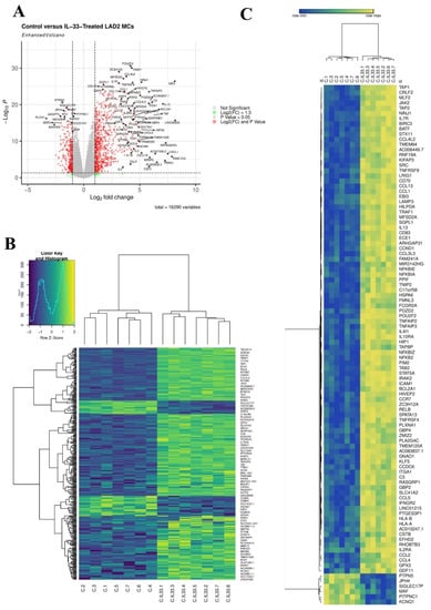 IL-33 induced 414 DEGs in MCs. (A), volcano plot of DEGs 6 h post IL-33 (10 ng/mL) treatment, n = 7. (B), Heatmap of all 414 DEGs 6 h post IL-33 (10 ng/mL) treatment, n = 7. (C), Hierarchal clustering heatmap of top 100 most significant DEGs 6 h post IL-33 (10 ng/mL) treatment, n = 7.