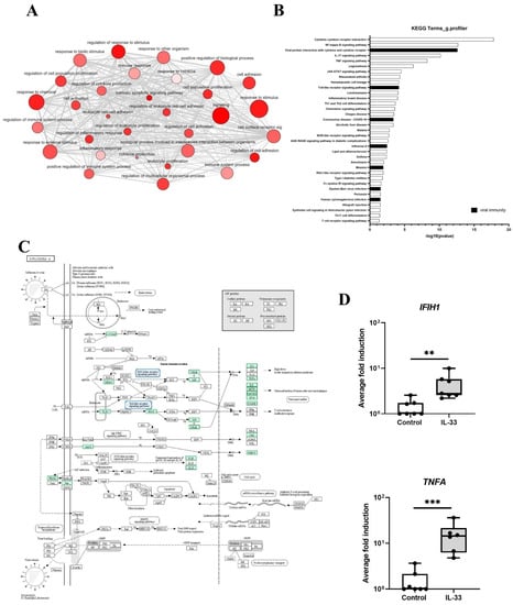 IL-33 induced DEGs associated with viral immunity in MCs. (A), gene enrichment map of GO terms analysed using g.profiler. (B), top KEGG pathways 6 h post IL-33 (10 ng/mL) treatment, n = 7. (C), genes associated with the influenza Pathway using KEGG on DEGs 6 h post IL-33 (10 ng/mL) treatment, n = 7. (D), mRNA expression of genes (IFIH1, TNFA) in influenza pathway 6 h post IL-33 stimulation (10 ng/mL), n = 7. ** p ≤ 0.01, *** p ≤ 0.001 for control versus IL-33.