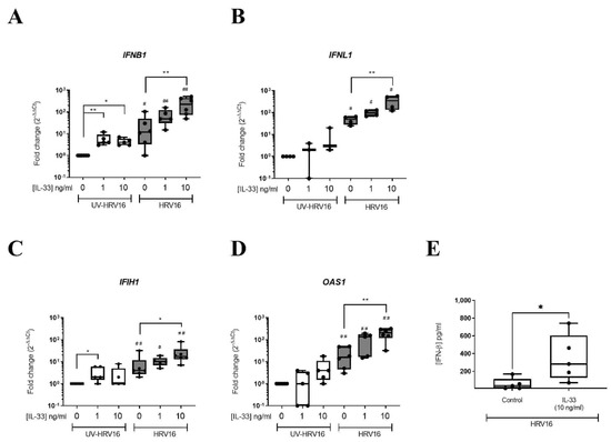 IL-33 enhanced HRV16-dependent anti-viral responses in MCs. mRNA expression of IFNs IFNB1 (A), IFNL1 (B) and IFN-stimulated genes IFIH1 (C), OAS1 (D) and IFN-β protein (E) in LAD2 MCs pretreated with or without IL-33 (1–10 ng/mL) for 24 h prior to HRV16 or UV-HRV16 (control) infection (MOI 7.5) for a further 24 h, n = 3–6. * p ≤ 0.05, ** p ≤ 0.01 for no cytokine versus IL-33 (1 or 10 ng/mL). # p ≤ 0.05, ## p ≤ 0.05 for UV-HRV16 versus HRV16.