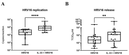 IL-33 enhances HRV16 replication and virion release in MCs. Viral RNA (A) and virion release (B) in LAD2 MCs pretreated with or without IL-33 (10 ng/mL) for 24 h prior to HRV16 infection (MOI 7.5) for a further 24 h, n = 15. ** p ≤ 0.01, **** p ≤ 0.0001 for HRV16 versus IL-33+HRV16.