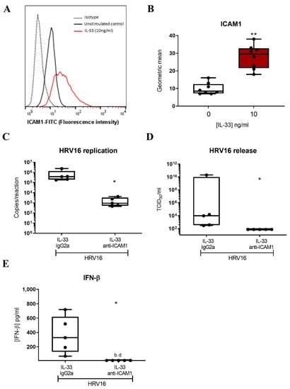 3.3. IL-33 Enhances HRV16 Replication and Release of Infectious Viral Particles through Increased ICAM-1 Expression