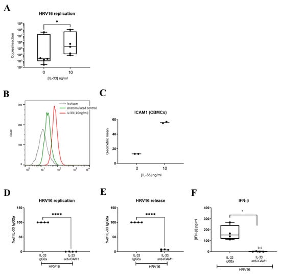 Role of ICAM1 in mediating IL-33-dependent enhancement of HRV16 replication in CBMCs. Viral RNA in CBMCs pretreated with or without IL-33 (10 ng/mL) for 24 h prior to HRV16 infection (MOI 7.5) for a further 24 h, n = 5 (A). A representative flow cytometric trace (B) and averaged geometric mean (C) for ICAM1 cell surface expression in MCs treated with IL-33 (10 ng/mL) for 24 h, n = 2. HRV16 replication (D), virion release (E) and IFN-β release (F) following IL-33 (10 ng/mL) stimulation for 24 h prior to HRV16 infection (MOI 7.5) in the presence or absence of anti-ICAM1 antibody or IgG2a isotype for a further 24 h, n = 4. * p ≤ 0.05 for no cytokine versus IL-33 and * p ≤ 0.05, **** p ≤ 0.0001 for IL-33 IgG2a+HRV16 versus IL-33 anti-ICAM1+HRV16.