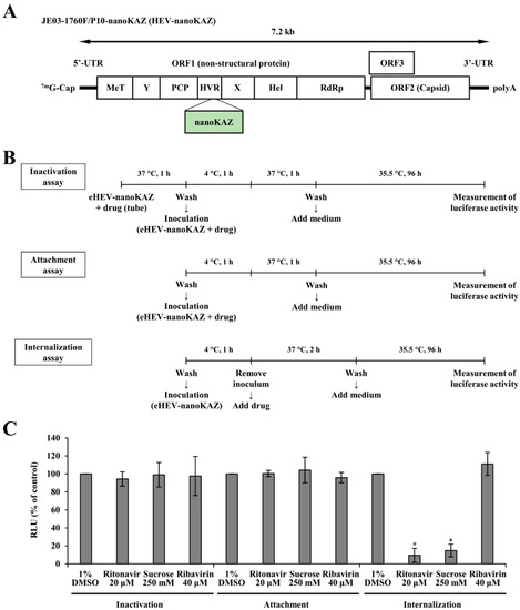 In our previous report, ritonavir was hypothesized to inhibit early steps of the HEV life cycle, such as attachment and internalization [31]. To determine which early stage in the HEV life cycle was blocked by ritonavir, a time-of-addition assay using eHEV-nanoKAZ (Figure 1A) was performed, consisting of viral inactivation, viral attachment, and viral internalization assays (Figure 1B). As references, we utilized sucrose to represent an inhibitor of clathrin-mediated endocytosis [39], as both viral particle forms of HEV (eHEV and neHEV) are known to depend on clathrin-mediated endocytosis [12]; and ribavirin, an inhibitor of HEV RNA replication [27].