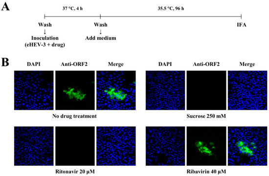 Confirmation of the inhibition of HEV internalization by ritonavir using an immunofluorescence assay. (A) A schematic representation of the immunofluorescence assay. (B) Immunofluorescence staining of the PLC/PRF/5 cells at day 4 post-inoculation with cell-culture-generated, membrane-associated genotype 3 HEV (JE03-1760F: eHEV-3) to examine the HEV ORF2 protein expression after treatment with ritonavir (20 µM), sucrose (250 mM), or ribavirin (40 µM), and compared to that of the untreated control cells. Results representative of one of two experiments are shown.