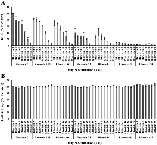 We attempted to combine ribavirin with ritonavir in the present study. Target-wise, this is a potential novel strategy for the treatment of chronic HEV infection where ribavirin, an HEV RNA replication inhibitor, was combined with ritonavir, which was found to be blocking HEV internalization in the current study (Figure 1C and Figure 2B). We first examined the inhibition effect of the ritonavir and ribavirin combination on the luciferase activity in the eHEV-nanoKAZ-inoculated PLC/PRF/5 cells in the presence of various doses of the combination. The drug combination decreased the intracellular luciferase activity in a dose-dependent manner (Figure 3A) without causing any significant effect on the cell viability (Figure 3B), indicating that the decreased intracellular luciferase activity was not due to cytotoxicity.