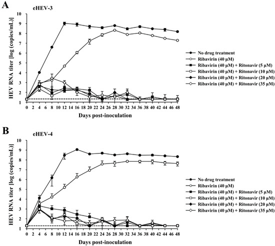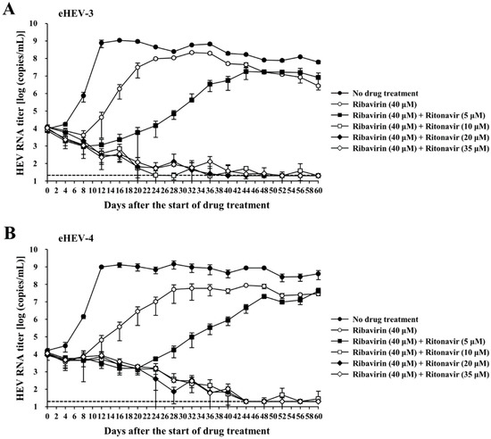 Efficacy of the ritonavir and ribavirin combination against HEV in the culture system consisting of either eHEV-3 (cell-culture-generated, membrane-associated genotype 3 HEV [JE03-1760F])—(A) or eHEV-4 (cell-culture-generated, membrane-associated genotype 4 HEV [HE-JF5/15F])—(B) producing PLC/PRF/5 cells, in the presence of ribavirin (40 µM) combined with various concentrations of ritonavir, in comparison to that of ribavirin monotherapy (40 µM). HEV growth was observed for 60 days in the presence of various concentrations of the drug combination. The data are presented as the mean ± SD of triplicate wells. The dotted horizontal line represents the limit of detection by real-time RT-PCR used in this study, at 2 × 101 RNA copies/mL.