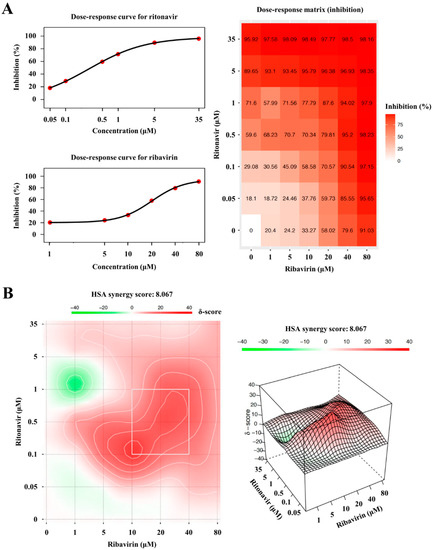 To determine the synergy of ritonavir and ribavirin combination, the browser-independent web application SynergyFinder version 2.0 was utilized in this study. The inhibition responses from a total of 49 combination doses used in Figure 3A were applied for the calculation. Dose–response plots of phenotypic responses for the single drug (i.e., response measurements, when the other drug doses were 0), fitted by four-parameter logistic curve, are presented for ritonavir (Figure 6A, upper left panel) and ribavirin (Figure 6A, lower left panel). The observed drug combination responses (Figure 6A, right panel) were compared with the expected combination responses calculated by the HSA reference model to determine the degree of synergism of ritonavir and ribavirin combination therapy, yielding a synergy score of 8.067 (the interaction between the two drugs classified as additive), visualized in two- (Figure 6B, left panel) and three-dimensional (Figure 6B, right panel) synergy maps.