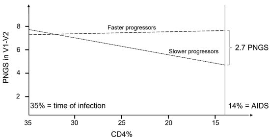 Schematic illustration of the evolution of PNGS as a function of CD4% for faster and slower progressors in the V1–V2 region. p-values for differences in slope between progressor groups was 0.014, and the p-values to test if the slope was different from zero were 0.007 and 0.822 for slower and faster progressors, respectively.