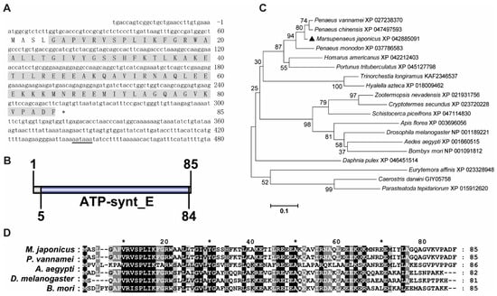 Sequence analysis of MjATP5I. (A) The nucleotide and deduced amino acid sequence of MjATP5I. The letters with a grey background represent the ATP synthase subunit e domain. The double-underlined nucleotides show the polyadenylation signal region. (B) The domain schematics of MjATP5I. MjATP5I contained an ATP synthase E domain with 80 amino acids. (C) The phylogenetic tree analysis of ATP5Is from different animal species, including Aedes aegypti, Amphibalanus amphitrite, Apis florea, Bombyx mori, Caerostris darwini, Cryptotermes secundus, Daphnia pulex, Drosophila melanogaster, Eurytemora affinis, Homarus americanus, Hyalella azteca, Marsupenaeus japonicus, Parasteatoda tepidariorum, Penaeus chinensis, Penaeus monodon, Penaeus vannamei, Pollicipes pollicipes, Portunus trituberculatus, Schistocerca piceifrons, Trinorchestia longiramus, and Zootermopsis nevadensis. MjATP5I is marked by a solid black triangle. All of the amino acid sequences were obtained from GenBank. (D) Multiple sequence alignment of ATP5Is from M. japonicus, P. vannamei, A. aegypti, D. melanogaster, and B. mori. The conserved sites are labeled by white letters with a black background.