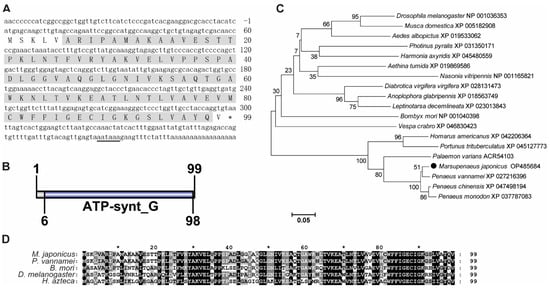 Sequence analysis of MjATP5L. (A) The nucleotide and deduced amino acid sequence of MjATP5L. The letters with a grey background represent the ATP synthase subunit g domain. The double-underlined nucleotides show the polyadenylation signal region. (B) The domain schematics of MjATP5L. MjATP5L contained an ATP synthase G domain with 93 amino acids. (C) Phylogenetic tree analysis of ATP5Ls from Aedes albopictus, Aethina tumida, Anoplophora glabripennis, Bombyx mori, Diabrotica virgifera virgifera, Drosophila melanogaster, Harmonia axyridis, Homarus americanus, Leptinotarsa decemlineata, Marsupenaeus japonicus, Musca domestica, Nasonia vitripennis, Palaemon varians, Penaeus chinensis, Penaeus monodon, Penaeus vannamei, Photinus pyralis, Portunus trituberculatus, and Vespa crabro. ATP5L from M. japonicus is labeled by a black solid circle. All of the amino acid sequences were obtained from GenBank. (D) Multiple sequence alignment of ATP5L from M. japonicus, P. vannamei, B. mori, D. melanogaster, and Hyalella azteca. The conserved sites are labeled by white letters with a black background.