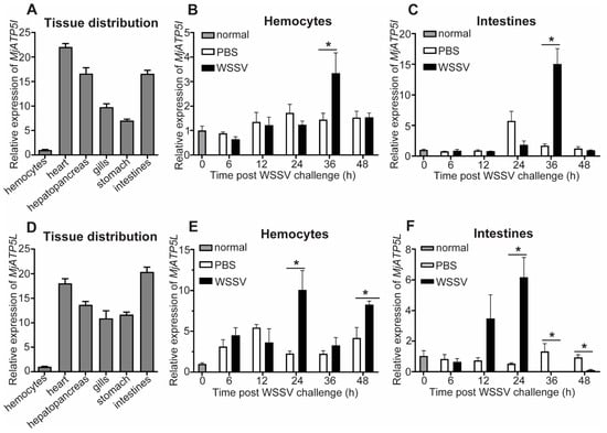 Expression pattern analysis of MjATP5I and MjATP5L. (A) Tissue distribution of MjATP5I in tissues such as hemocytes, heart, hepatopancreas, gills, stomach, and intestines. (B,C) Expression profiles of MjATP5I in hemocytes (B) and intestines (C) post WSSV challenge. (D) Tissue distribution of MjATP5L in different tissues. (E,F) Expression profiles of MjATP5L in shrimp hemocytes (E) and intestines (F) after WSSV challenge. The PBS injected shrimp were used as the control. The results are expressed as the mean ± SD and significant differences were analyzed between the PBS-injected group and the WSSV-injected group using Student’s t-test. *, p < 0.05.
