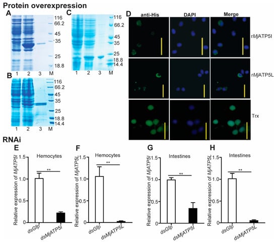 Recombinant protein injection and RNAi effect detection for MjATP5I and MjATP5L in shrimp. The recombinant expression and protein purification of MjATP5I (A), MjATP5L (B), and Trx (C) in E. coli. Lane 1, total protein of E. coli with MjATP5I-pET32a, MjATP5L-pET32a, or empty pET-32a(+) vector without induction; lane 2, total protein of E. coli with MjATP5I-pET32a, MjATP5L-pET32a, or empty pET-32a(+) vector induced with 0.5 mM IPTG; lane 3, the purified rMjATP5I, rMjATP5L, or Trx; lane M, the standard protein marker. (D) Immunocytochemistry assay to detect the entrance of rMjATP5I, rMjATP5L, or Trx into shrimp hemocytes. The recombinant proteins in shrimp hemocytes were indicated by the green fluorescence signals, and the nuclei were stained by DPAI and shown by blue signals. Scale bar = 20 μm. (E,F) RNA interference effects of MjATP5I and MjATP5L were detected in hemocytes after RNAi. (G,H) Interference effects of MjATP5I and MjATP5L were detected in intestines after RNAi. The results are expressed as the mean ± SD and significant differences were analyzed between the dsMjATP5I-injected or dsMjATP5L-injected group and the dsGfp-injected group using Student’s t-test. **, p < 0.01.
