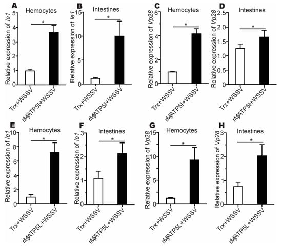The relative expression of Ie1 and Vp28 gene after recombinant protein injection. (A–D) The expression of Ie1 (A,B) and Vp28 (C,D) in hemocytes and intestines after rMjATP5I injection. (E–H) The expression of Ie1 (E,F) and Vp28 (G,H) in hemocytes and intestines after rMjATP5L injection. The results are expressed as the mean ± SD and significant differences were analyzed between rMjATP5I- or rMjATP5L-injected group and Trx-injected group using Student’s t-test. *, p < 0.05.