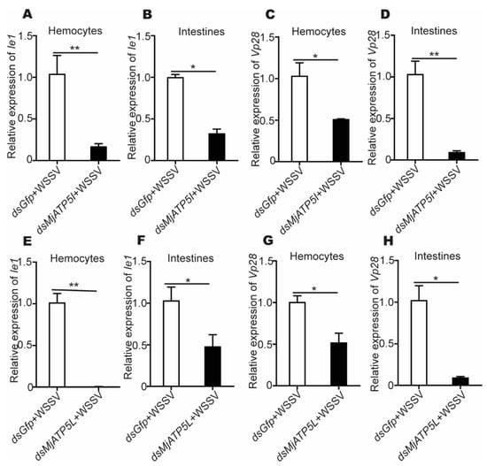 The relative expression of Ie1 and Vp28 after RNAi. (A–D) The relative expression of Ie1 (A,B) and Vp28 (C,D) in hemocytes and intestines after MjATP5I knocking down. (E–H) The relative expression of Ie1 (E,F) and Vp28 (G,H) in hemocytes and intestines after MjATP5L knocking down. The results are expressed as the mean ± SD and significant differences were analyzed between the dsMjATP5I-injected or dsMjATP5L-injected group and the dsGfp-injected group using Student’s t-test. *, p < 0.05, **, p < 0.01.