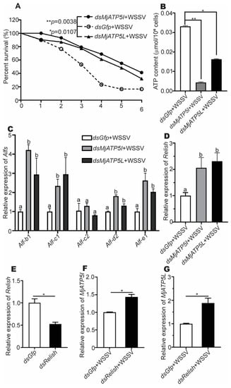 The survival rate, ATP content detection, and the genes relative expression after RNAi and WSSV challenge. (A) Survival rates of the dsMjATP5I-injected and dsMjATP5L-injected shrimp compared with the dsGfp-injected shrimp after WSSV infection. The survival rate was calculated to present the survival curves as Kaplan–Meier plots. Differences between the MjATP5I RNAi group or MjATP5L RNAi group and the Gfp RNAi group were analyzed using the Log-rank test in the GraphPad Prism 8.0 program. (B) The content of ATP in hemocytes after MjATP5I and MjATP5L RNAi with WSSV challenge. The dsGfp-injected shrimp were used as the control. The results are expressed as the mean ± SD and significant differences were analyzed between the dsMjATP5I-injected or dsMjATP5L-injected group and the dsGfp-injected group using Student’s t-test. *, p < 0.05, **, p < 0.01. (C,D) Expression of Alfs (C) and Relish (D) in hemocytes after MjATP5I and MjATP5L knockdown. The columns are expressed as the mean ± SD, and the differences were calculated by the ordinary one-way ANOVA with multiple comparisons. The identical letters indicate there are no significant differences between the two groups for the same gene (p > 0.05), while different letters indicate significant differences between two groups of the same gene (p < 0.05). The dsGfp-injected shrimp were used as the control. (E) Expression of Relish in shrimp hemocytes after dsRelish injection. (F,G) The relative expression of MjATP5I (F) and MjATP5L (G) in hemocytes after Relish knockdown and WSSV infection. The results are expressed as the mean ± SD and significant differences were analyzed between the dsMjATP5I-injected or dsMjATP5L-injected group and the dsGfp-injected group using Student’s t-test. *, p < 0.05.