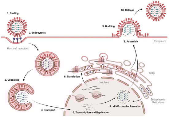 Replication cycle of influenza virus. First, the virus binds via HA to sialic acid residues on the host cell (Step 1) and is taken up into the cell via endocytosis (Step 2). After acidification of the endosome and viral interior, the vRNPs are released in the cytosol (Step 3) and transported in the nucleus (Step 4), where the viral RNA is transcribed and replicated (Step 5). Viral mRNAs are transported in the cytosol for translation (Step 6). NPs and the subunits of the viral polymerase PA, PB1, and PB2 are transported back in the nucleus to form new vRNP complexes (Step 7). vRNPs and HA, NA, and M1 are transported to the cell surface for assembly (Step 8). The virion buds from the cell surface (Step 9). In the final step, NA cleaves sialic acids from the cell surface and progeny virions, enabling virus release from infected cells (Step 10). Adapted from “HIV Replication Cycle”, by BioRender.com (2022) (accessed on 20 September 2022). Retrieved from https://app.biorender.com/biorender-templates (accessed on 20 September 2022).