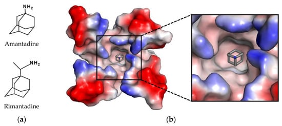 Structures of approved M2 channel inhibitors. (a) Chemical structure of amantadine and rimantadine. (b) Complex of amantadine (shown as sticks with grey carbon atoms and nitrogen in blue) in the pore of the M2 channel. The surface of the M2 channel was colored according to is calculated negative (−64 kT/e, red) and positive (+64 kT/e, blue) electrostatic potential. The structure was determined by X-ray crystallography (10.2210/pdb3C9J/pdb) []. The figure was generated with PyMOL Molecular Graphics System Version 2.0 (Schrödinger, LLC, New York, NY, USA).