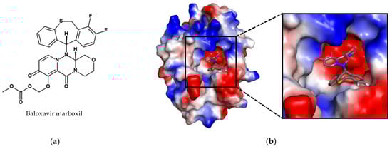 Structure of the approved cap-dependent endonuclease inhibitor baloxavir marboxil. (a) Chemical structure of the prodrug baloxavir marboxil. (b) Crystal structure of baloxavir (shown as sticks with grey carbon atoms, oxygen in red, nitrogen in blue, and fluorine in cyan) in the binding cleft of endonuclease. The surface of the endonuclease was colored according to is calculated negative (−69 kT/e, red) and positive (+69 kT/e, blue) electrostatic potential. The structure was determined by X-ray crystallography (10.2210/pdb6FS6/pdb) []. The figure was generated with PyMOL Molecular Graphics System Version 2.0 (Schrödinger, LLC, New York, NY, USA).