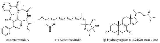 Structures of asperterrestide A [], (+)-neocitreoviridin [], and 3β-hydroxyergosta-8,14,24(28)-trien-7-one [].