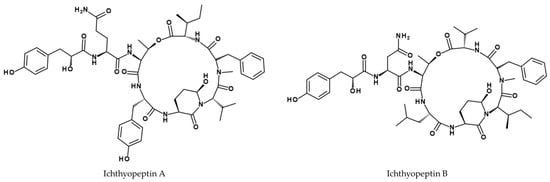 A fraction containing both small oligopeptides ichthyopeptin A and B (see Figure 8) from Microcystis ichthyoblabe strain BM Mi/13 exhibited antiviral effects against influenza virus A/WSN/33 (H1N1) with an IC50 value of 12.5 µg/mL [].