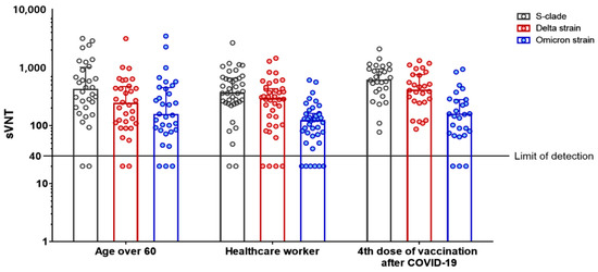 Between 17 May 17 and 9 June 2022, 125 participants (86 patients aged ≥60 years and 39 HCWs) with primary PCR-confirmed SARS-CoV-2 infection between February 16 and March 16, 2022, presumed by the Omicron variant (BA.1), were enrolled in this study. We analyzed the results of the sVNT of serum samples obtained approximately 3 months after their infections in Cohorts 1–3 and 5, and approximately 4 weeks after the second booster (fourth dose) vaccination in Cohort 4 (Figure 1).