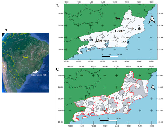 - CEPERJ. Fundação Centro Estadual de Estatística, Pesquisa e Formação de Servidores Públicos do Rio de Janeiro. Divisão Regional Segundo as Mesorregiões, Microrregiões Geográficas e Municípios. Estado do Rio de Janeiro—Posição e Extensão 2016. Available online: http://www.fesp.rj.gov.br/ceep/info_territorios/posicao_extencao.html (accessed on 12 June 2022).