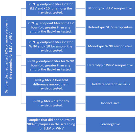 Samples with PRNT90 titer equal to or higher than 20 for WNV or SLEV and <10 for all other flaviviruses tested were considered seropositive in monotypic reactions. Additionally, samples that presented heterologous reactions, with PRNT90 titers for SLEV or WNV at least four times higher than that observed for the other flaviviruses tested, were also considered seropositive [32]. Samples that presented a titer less than four-fold greater for any flavivirus were considered seropositive for undifferentiated flaviviruses. Samples that presented PRNT90 titer 10 for any flavivirus tested—SLEV, WNV, DENV-1, ILHV or ZIKV—were considered inconclusive. Samples with PRNT90 < 10 for all flaviviruses were considered seronegative (Figure 2).