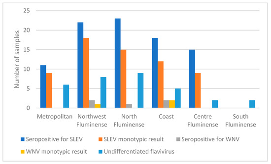 Despite variation in seropositivity for both viruses among the mesoregions, differences were statistically significant only for SLEV. The mesoregions with the highest seroprevalence for SLEV and WNV were Northwest Fluminense and Coast (for SLEV, p < 0.001). In the same mesoregions, including the north of RJ, we observed higher prevalence of monotypic reactions. Besides high humidity and temperature, both of these mesoregions are also characterized by recent increases in development and urbanization [75]. South Fluminense was the only mesoregion that had no evidence of SLEV or WNV infection and presented a low prevalence of undifferentiated flaviviruses. The WNV results in the South Fluminense mesoregion corroborate the findings presented by a previous ELISA-based study conducted with horses from the same mesoregion [30].