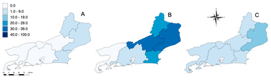 Location of equines that were seropositive (using PRNT90) for WNV (A), SLEV (B) and undifferentiated flavivirus (C) in RJ. Higher color intensity indicates higher seroprevalence (%).