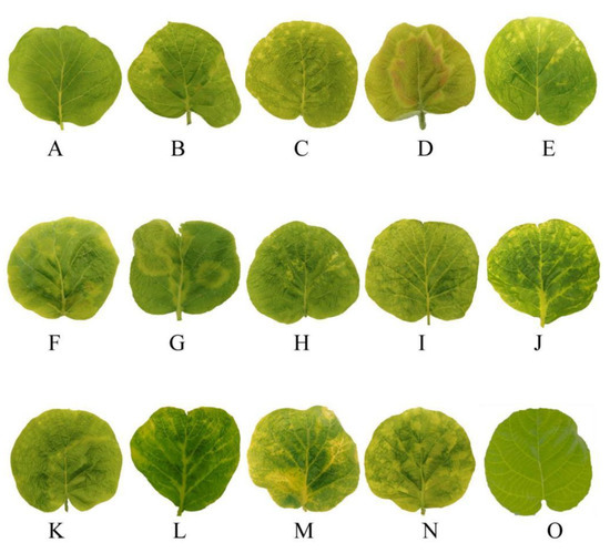 Symptoms of single and co-infections of Hongyang kiwifruits in the Sichuan province with AcVA, AcVB, AcCRaV, and CMV. Note: (A), AcVA; (B), AcVB; (C), AcCRaV; (D), CMV; (E), AcCRaV + AcVA; (F), AcCRaV + CMV; (G), AcVA + CMV; (H), AcVB + AcCRaV; (I), AcVB + CMV; (J), AcVA + AcVB; (K), AcVA + AcCRaV + CMV; (L), AcVA + AcVB + AcCRaV; (M), AcVB + AcCRaV + CMV; (N), AcVA + AcVB + AcCRaV + CMV; (O), normal leaves.