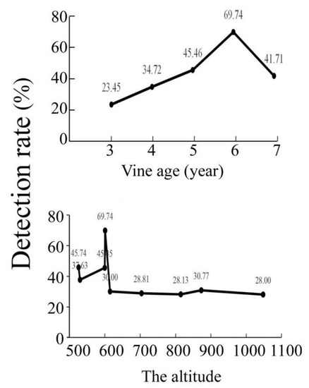 3.3. The Detection Rate Was Affected by Vine Age and Altitude