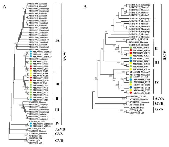 Phylogenetic analysis of AcVA (A) and AcVB (B), based on the CP genes. Note: Branches with a bootstrap value of > 60% are shown. Light blue represents the Ya’an isolate, green represents the Pujiang isolate, red represents the Qionglai isolate, yellow represents the Cangxi isolate, and dark blue represents the Dujiangyan isolate.