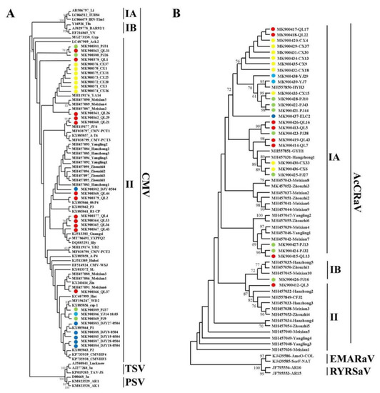 Phylogenetic analysis of CMV (A) and AcCRaV (B), based on CP genes. Note: Branches with a bootstrap value of > 60% are shown. Light blue represents the Ya’an isolate, green represents the Pujiang isolate, red represents the Qionglai isolate, yellow represents the Cangxi isolate, and dark blue represents the Dujiangyan isolate.