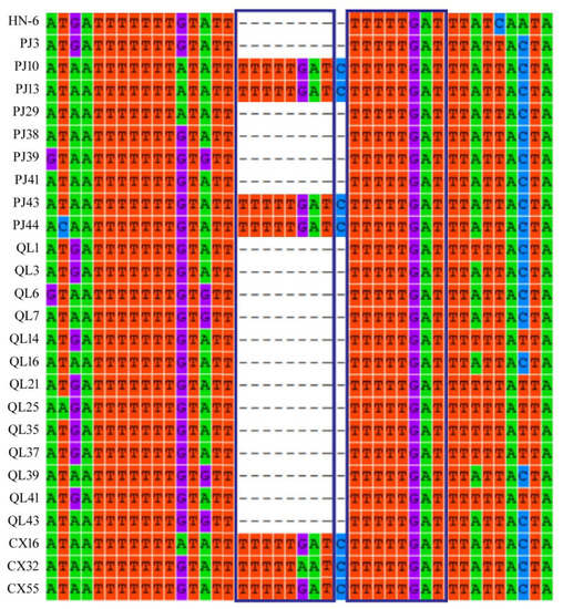 We found that the 5′-terminal non-coding region of RNA3 was highly variable (Table S19). The 461 to 471 bp fragment of the 5′-terminal non-coding region of RNA3 in the samples PJ10, PJ13, PJ43, PJ44, CX14, CX32, and CX55 had an eight-base repeat (TTTTTGAT) (Figure 5). However, sequence analysis of other isolates did not find these repeated sequences. Unique eight-nucleotide (TTTTTGAT) repeats were found in the 5′-terminal non-coding region of the AcCRaV RNA3 in a possible association with reduced disease symptoms (Figure 6).