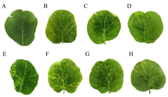 Comparison of symptoms of the 5′-terminal non-coding region insertion type and the non-insertion type of AcCRaV. Note: (A–D), 5′-terminal non-coding region insertion of AcCRaV; (A), PJ10; (B), PJ13; (C), PJ43; (D), CX5; (E,F), non-insertion AcCRaV; (E), PJ39; (F), QL3; (G), QL7; (H), QL16.