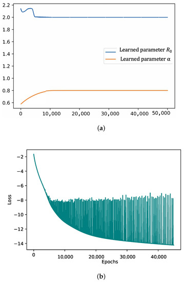 For our testing, we fixed the known values , , and . and were chosen for the unknown parameter values. We ran over a time interval of 40 days with 400 data points distributed evenly. The code was run for 50,000 epochs and executed in 3 h. We see in Figure 2 that the correct values for the unknown parameters were converged to quite rapidly and in a stable fashion. The oscillations in the loss function were not unexpected, as we noted that the oscillations were small due to the logarithmic scale. This was essentially just the process where once the loss was small enough, the network could no further diminish the loss without passing through regions where the loss increased temporarily while the Adam optimizer ran.