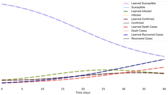 Visually, we can see in Figure 3 how each learned time series (the dotted lines) overlapped almost precisely with the true time series. Clearly, in this example, the modified PINN performed quite sufficiently in identifying both the parameters and the unavailable time series information.