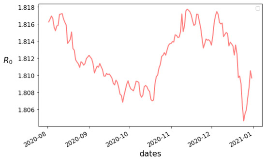 The assumption that the parameters in Equation (1) are constant (i.e., time-independent) is a highly restrictive and unrealistic one for long-enough time scales. In a real-world scenario, many of these parameters are changing as time passes, due to factors such as mutations of the virus and a shifting government policy; the latter is well-known to modify social interactions in the case of nonpharmacological interventions and hence affect factors such as [6,18]. In this case, we update the model in (1) to replace and with and , while and are left fixed as they are relatively well-known, stable parameters. In the case of mutations, it is not unreasonable to expect variations of these parameters too, but for the cases under consideration, we expect such variations to be small and anyway secondary to the above effects. This gives the alternate model:
