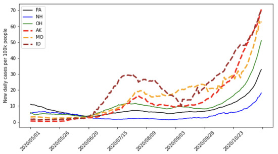 For 90 days starting from 1 May 2020, we plotted the confirmed cases of the bottom 3 estimated values, corresponding to states PA, NH, and OH, as well as the top 3 estimated values, corresponding to states ID, AK, and MO. We can see that ID, AK, and MO had a smaller number of cases in May 2020. Their confirmed case counts significantly grew after the middle of June though.