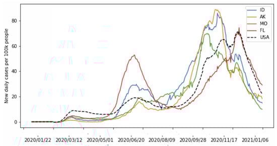 All nonsimulated data on COVID-19’s development used in this paper were pulled from the tool developed in [33]. The tool aggregates data from a variety of data sources including the WHO, each state’s individual department of health, and the CDC. The data used included reports on case counts, active cases, and deaths within each individual U.S. state. We also include a direct link to the github for the tool here: https://github.com/CSSEGISandData/COVID-19 (accessed on 29 August 2022).